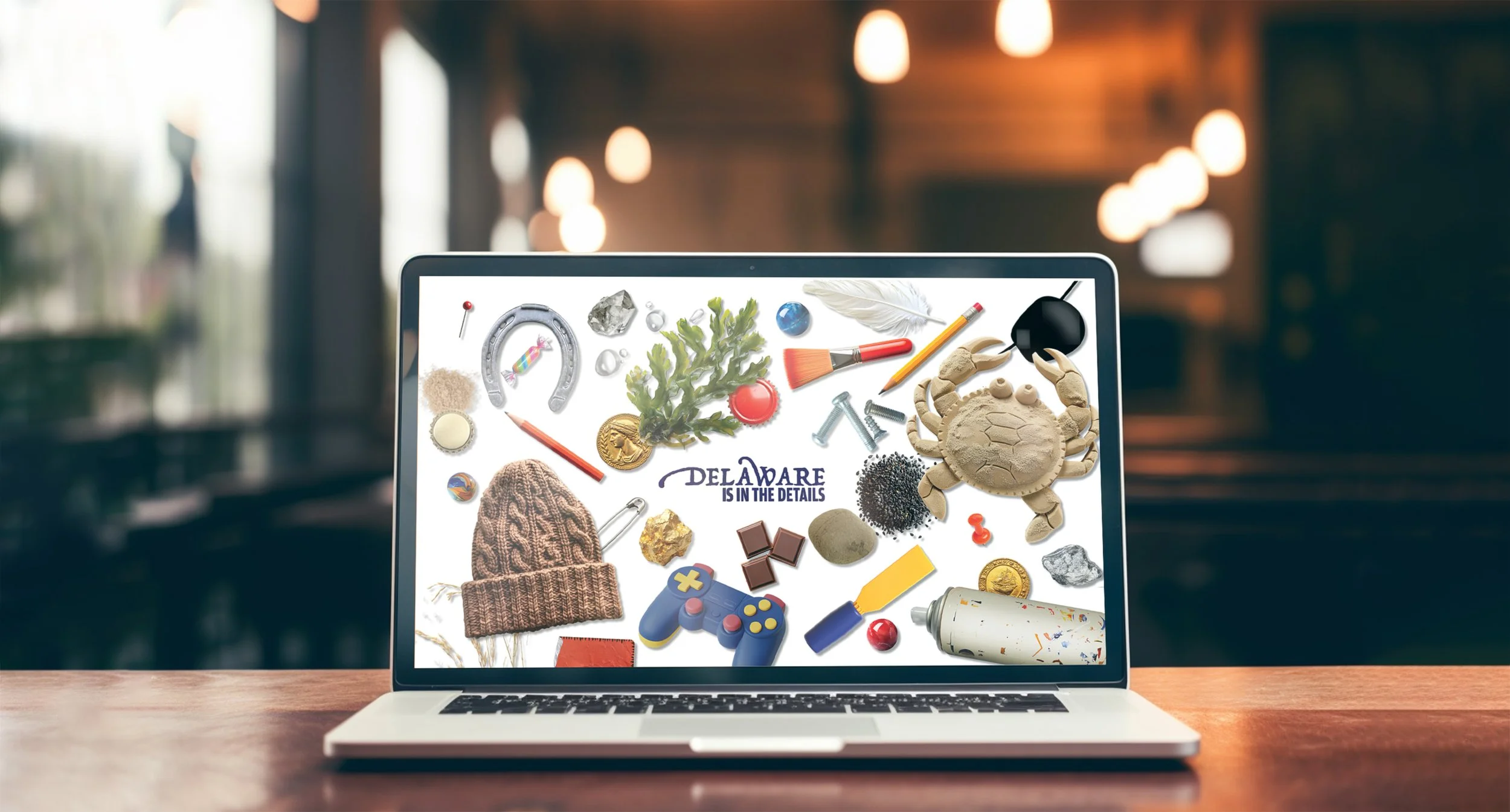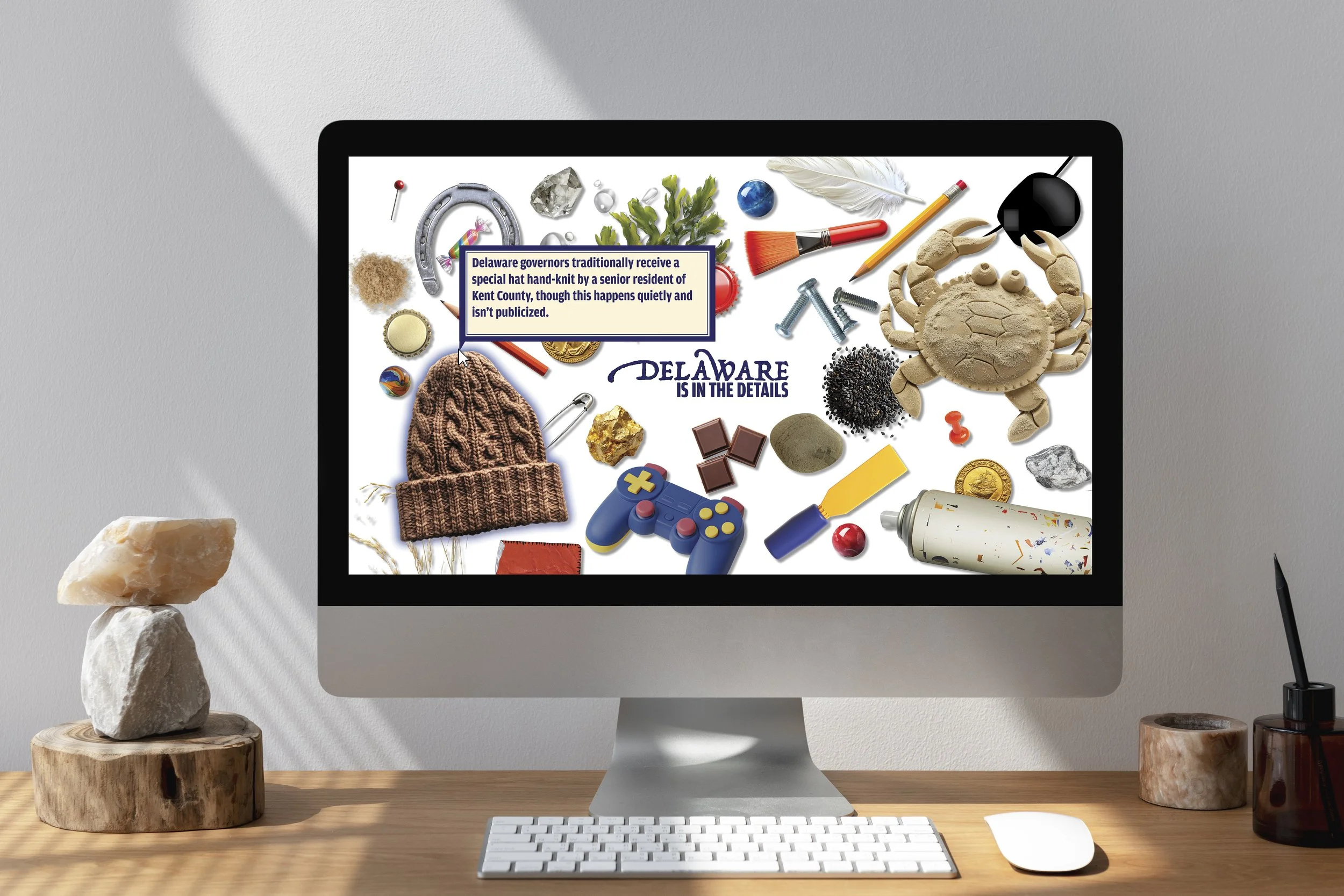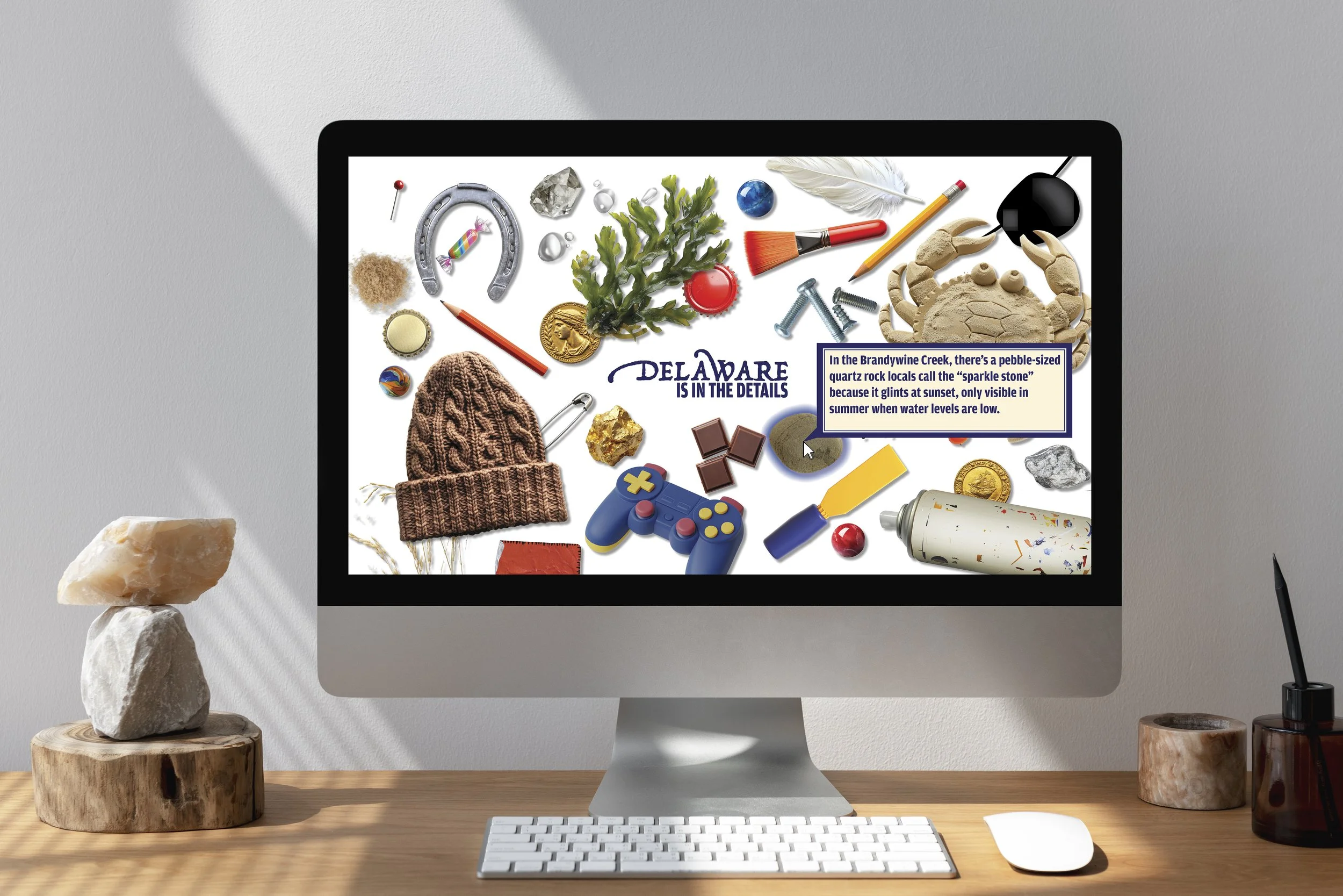 An I-Spy-esque webpage where users can hover their cursor over objects that represent endearing details about Delaware to learn more.